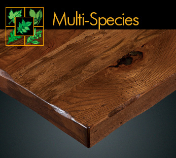 Our rustic multi-species top are physically distressed and available in two standard edge styles. Constructed with red oak, maple, birch, cherry, and ash species. To create your one-of-a-kind look, add optional hand scraping, v-grooving, rustic finish, or metal accents. |