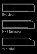 1-1/4" thick laminate overlay topwith a 1" wide solid wood edge. Shown with a Waterfall edge detail, Curved apron and Tapered legs.