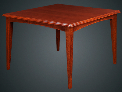 1-1/4” thick wood veneer inlay top with a 1-1/4” wide solid wood edge. Shown with a Cove Ogee edge detail, Notched apron and Tapered legs.